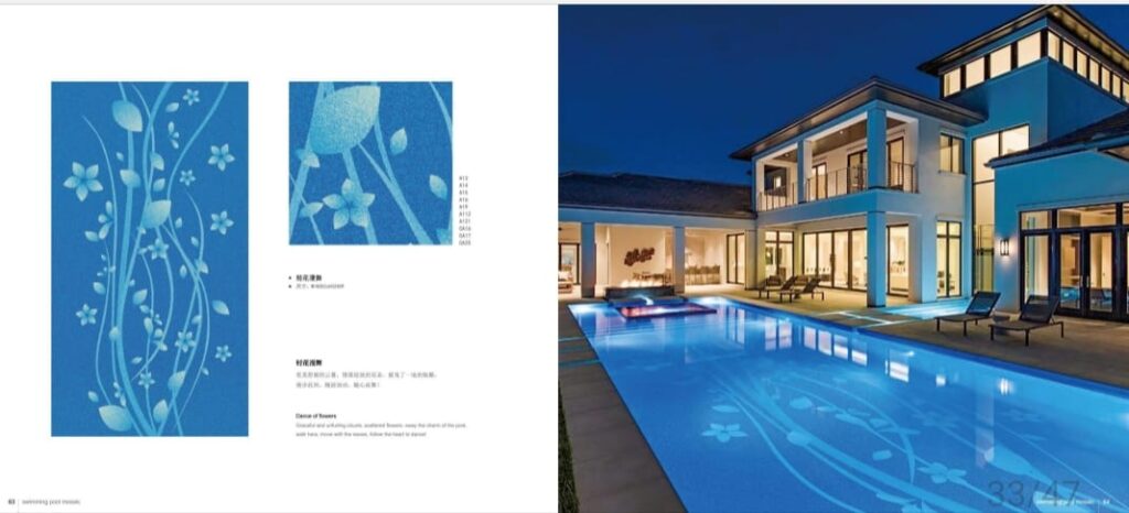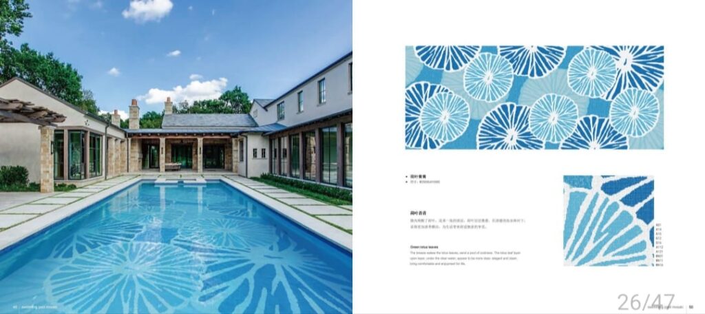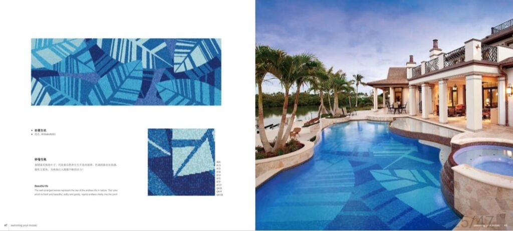 • Mozaik Biru Klasik – Memberikan kesan segar dan jernih pada kolam renang.