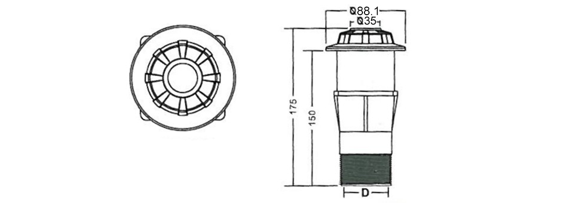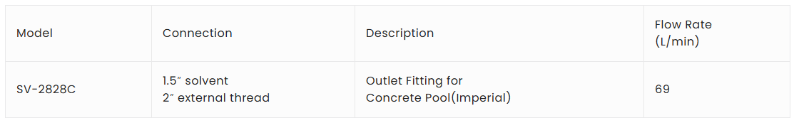 The Outlet Fitting SV-2828C for Concrete Pool is made of ABS material, with 1.5inch solvent, 2inch external thread, suitable for concrete pool.