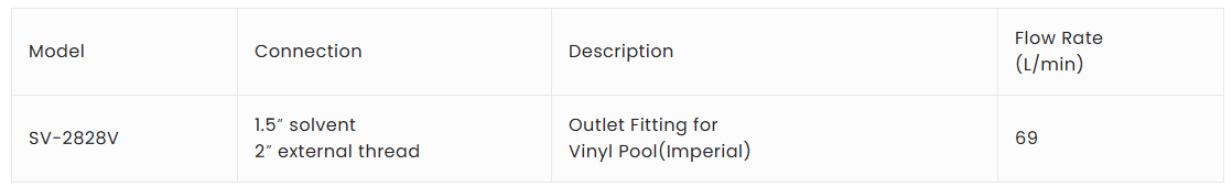 The Outlet Fitting SV-2828V water return is made of ABS material, which it is with 1.5inch solvent,2inch external thread size, and suitable for vinyl pool.