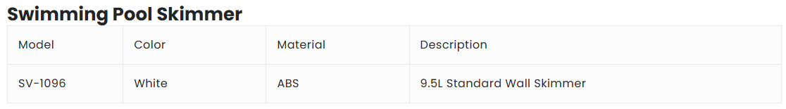 The heavy-duty Standard Wall Skimmer SV-1096 can be used for residential and commercial swimming pools suitable for concrete, fiberglass and vinyl surfaces. The 3 models are injection molded and made with ABS material; the reinforced material provides the maximum strength and durability for all weather conditions. The high flexibility design allows 1.5″ or 2″ suction connections to the piping.