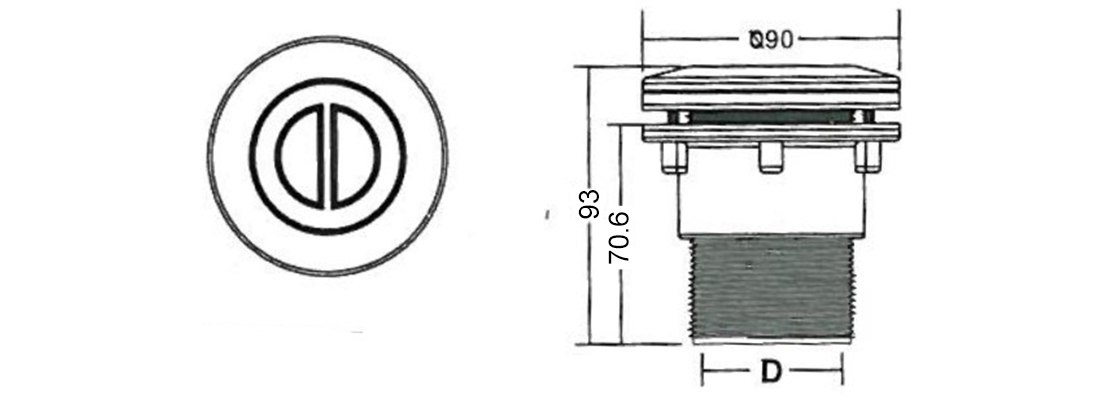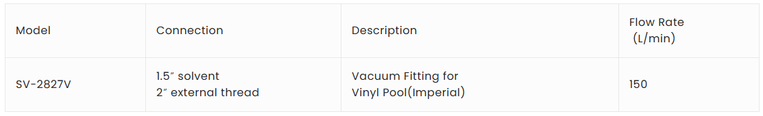 The Suction Nozzle SV-2827V is for vinyl pool with 1.5inch inner size and outer size is 2” with screw, the flow rate is 150L/min.