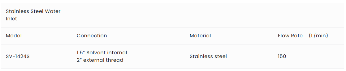 The Water Inlet SV-1424S is made of high quality stainless steel material. With 150L/min flow rate, available for 1.5inch,2inch and 3inch external thread size.